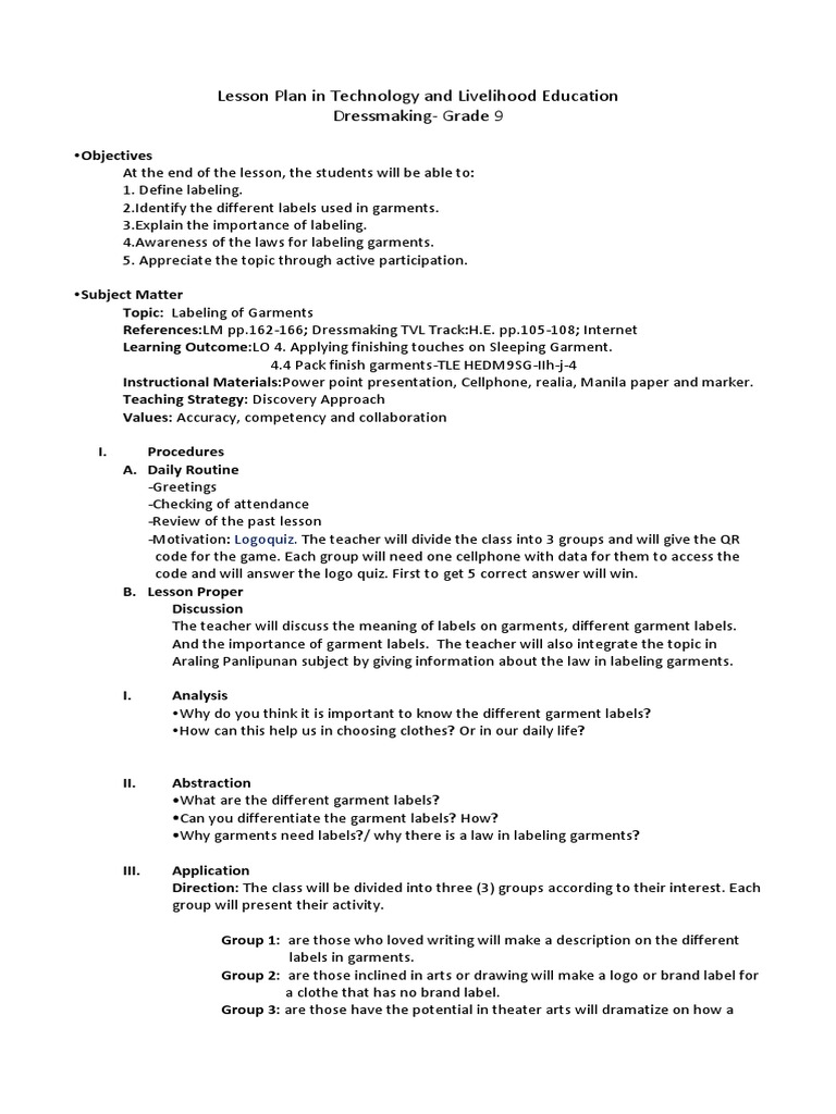 References:LM pp.162-166; Dressmaking TVL Track:H.E. pp.105-108; Internet
