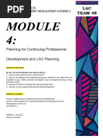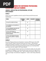 This document summarizes Module 4 Lesson 1 of a teacher training course. It includes 3 activities: 1) Complete a self-assessment questionnaire to evaluate teaching skills and capabilities. 2) Reflect on teaching standards and identify areas for improvement, such as content knowledge and community engagement. 3) Set goals for improving teaching practice using new instructional materials and identify motivations and support needed to achieve these goals.