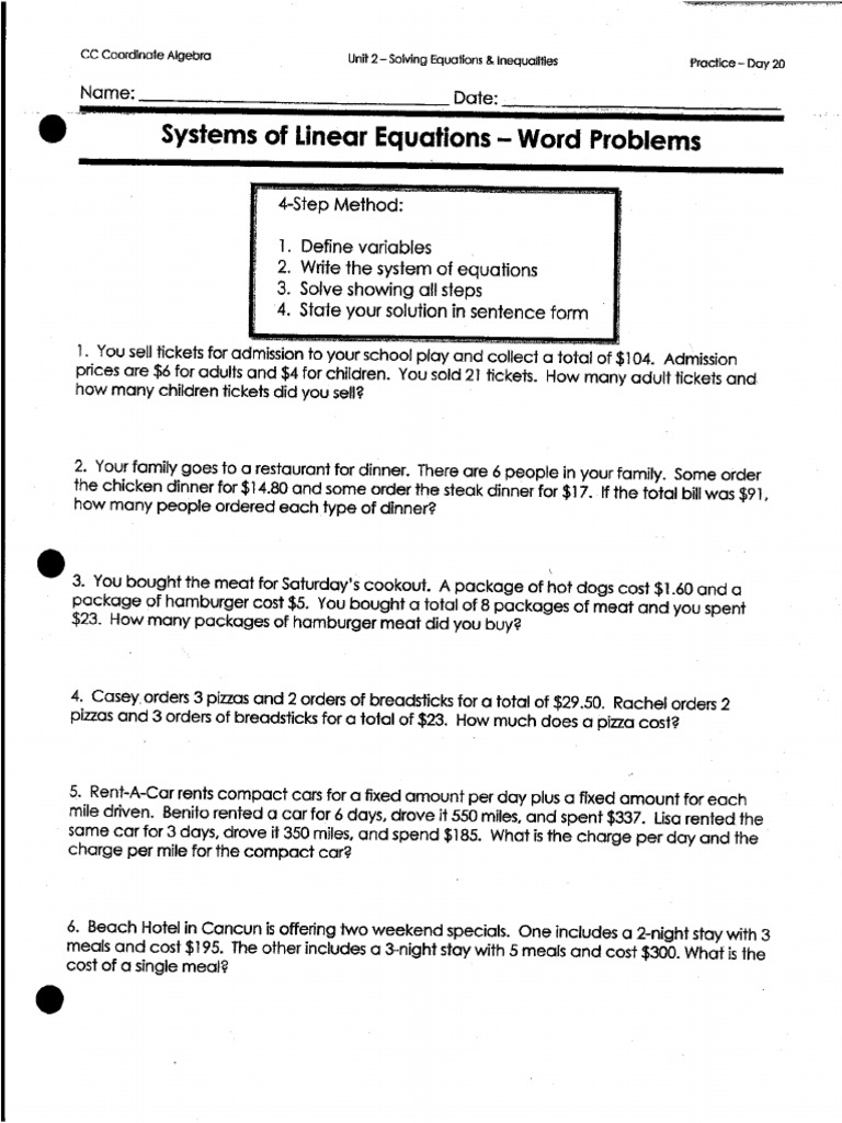 cost of a single meal?Coord. Alg 2.9 - Setting up Problems Homework