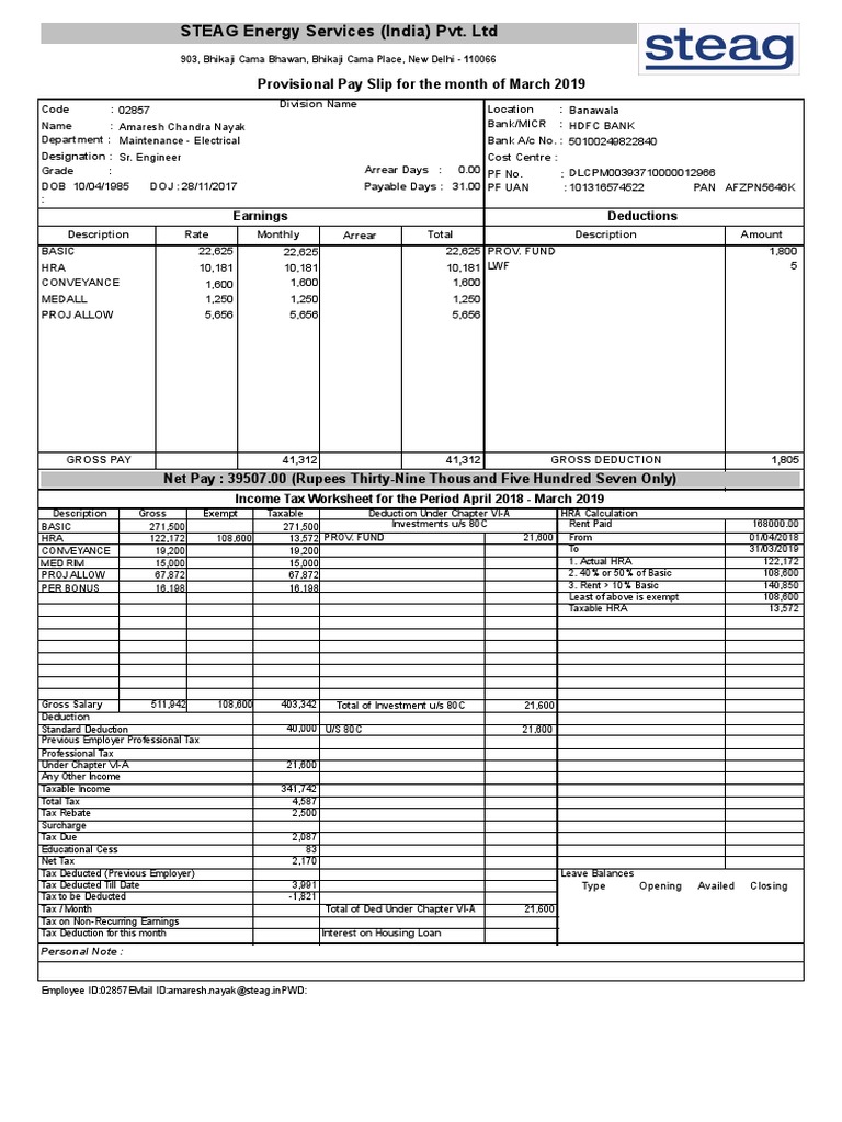 HRA 122,172 108,600 13,572 PROV. FUND 21,600 From 01/04/2018