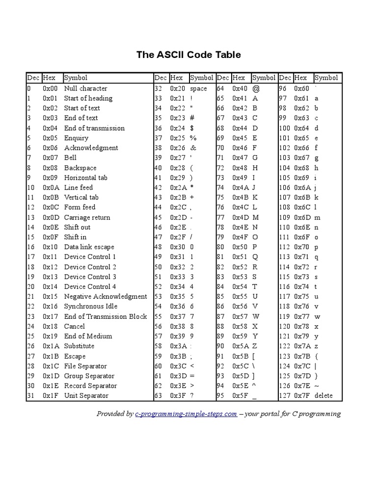 31 0x1F Unit Separator 63 0x3F ? 95 0x5F _ 127 0x7F delete