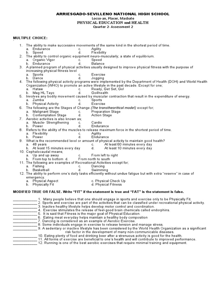 ____________ 5. It is said that Fitness is the major goal of Physical Education.