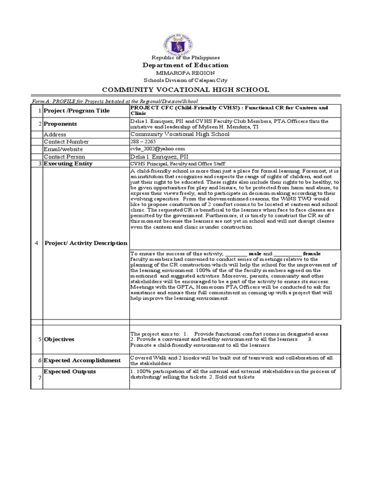Form A: PROFILE for Projects Initiated at the Regional/Division/School