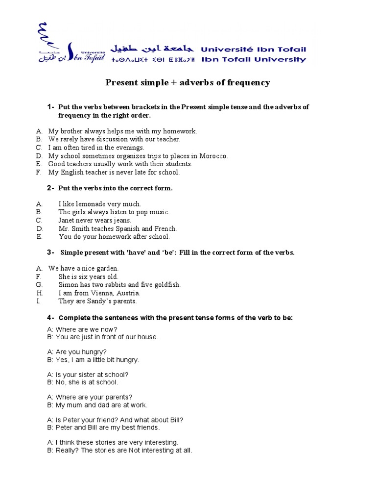 1- Put the verbs between brackets in the Present simple tense and the adverbs of