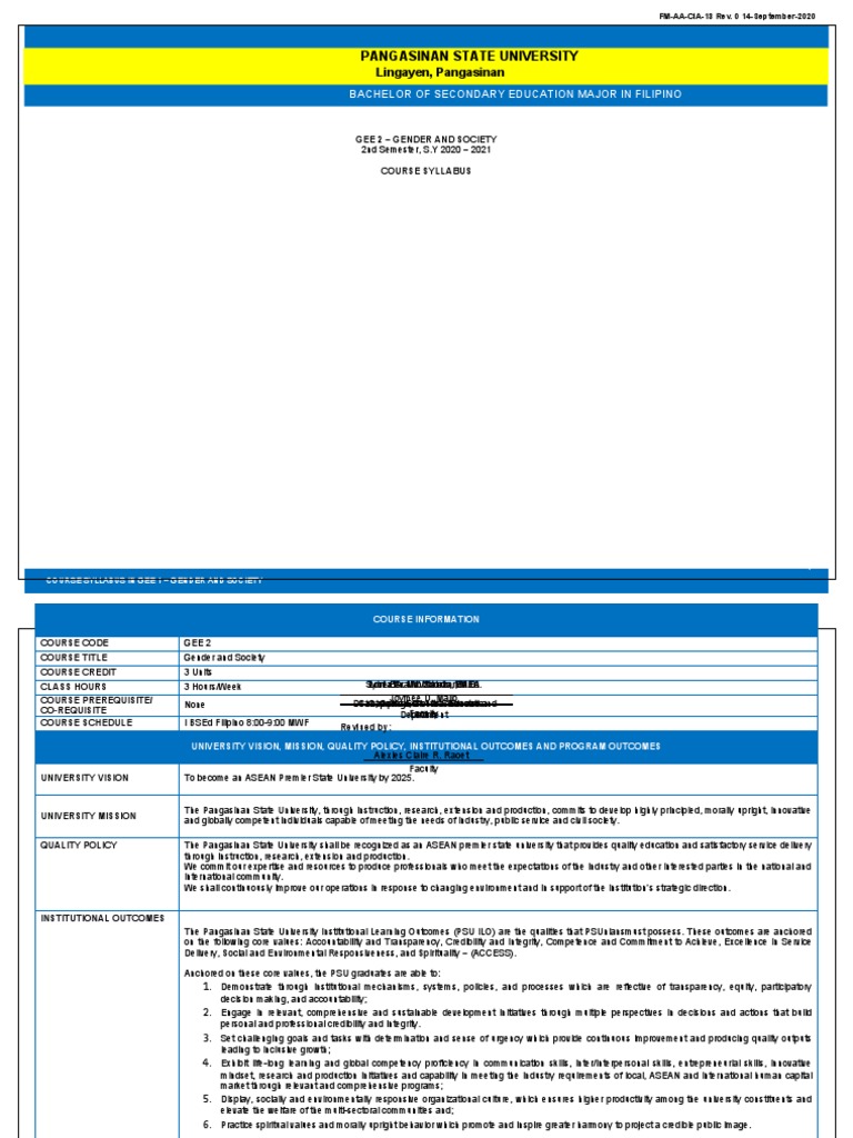 COURSE SYLLABUS IN GEE 1 – GENDER AND SOCIETY