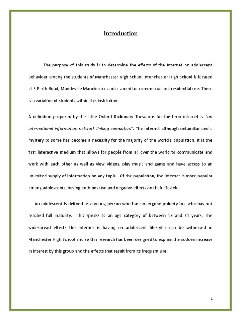 The purpose of this study is to determine the effects of the Internet on adolescent