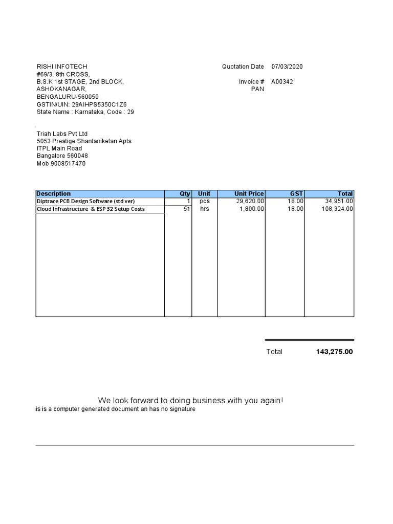 B.S.K 1st STAGE, 2nd BLOCK, Invoice # A00342