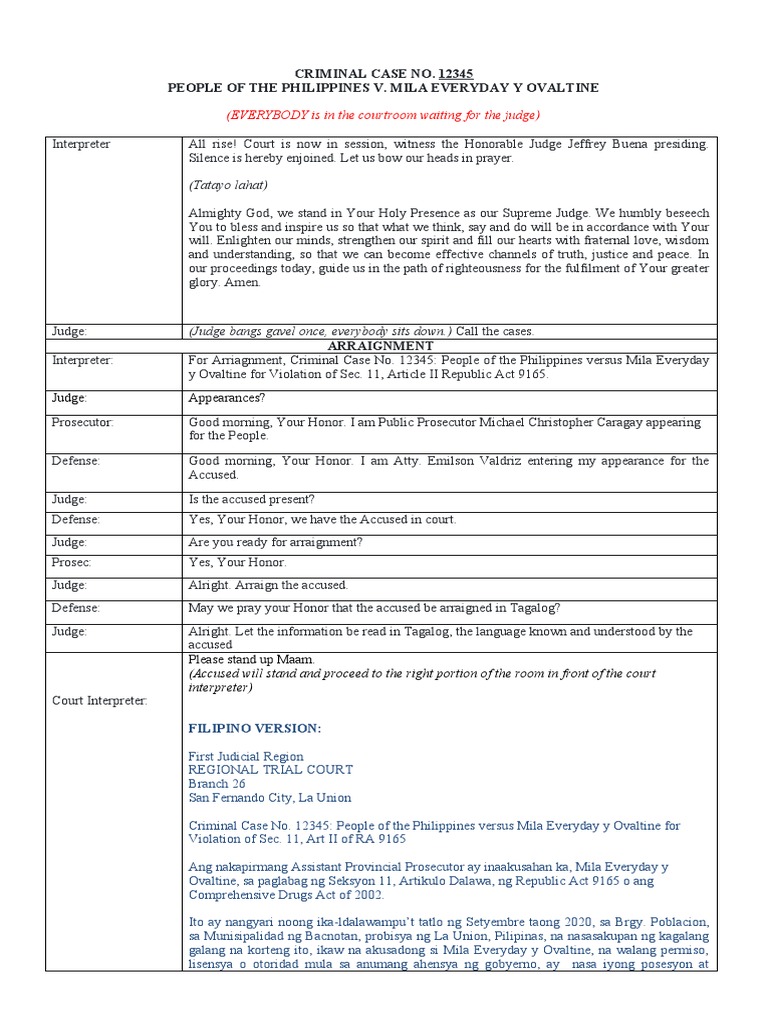Interpreter: For Arriagnment, Criminal Case No. 12345: People of the Philippines versus Mila Everyday