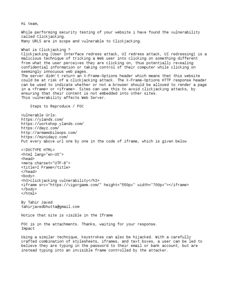 Many URLS are in scope and vulnerable to Clickjacking.