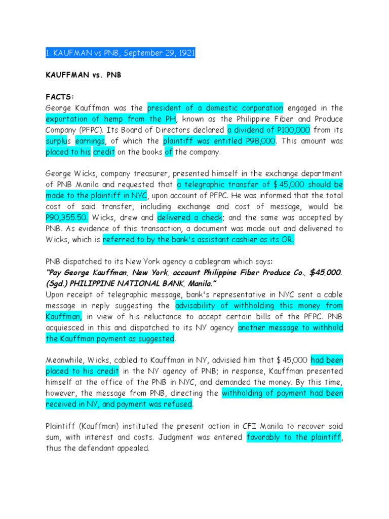 KAUFMAN vs PNB, September 29, 1921