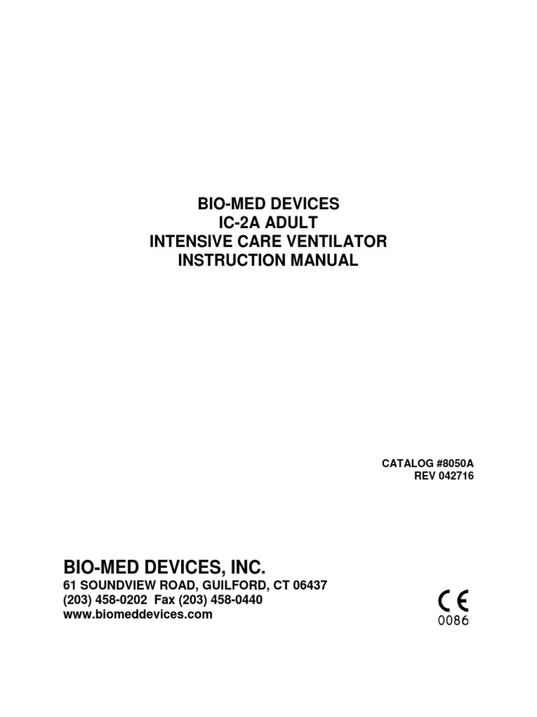 Bio-Med Devices Ic-2A Adult Intensive Care Ventilator Instruction Manual