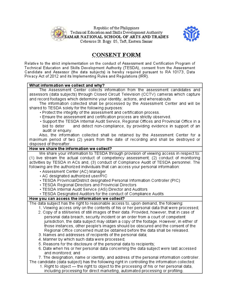 Technical Education and Skills Development Authority (TESDA), consent from the Assessment