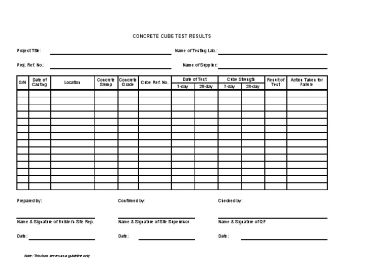 Date of Concrete Concrete Date of Test Cube Strength Result of Action Taken for