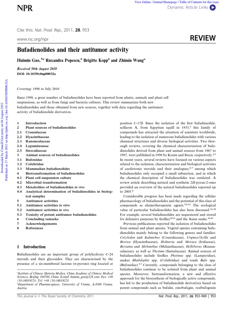 Bufadienolides and Their Antitumor Activity: Cite This: Nat. Prod. Rep., 2011, 28, 953