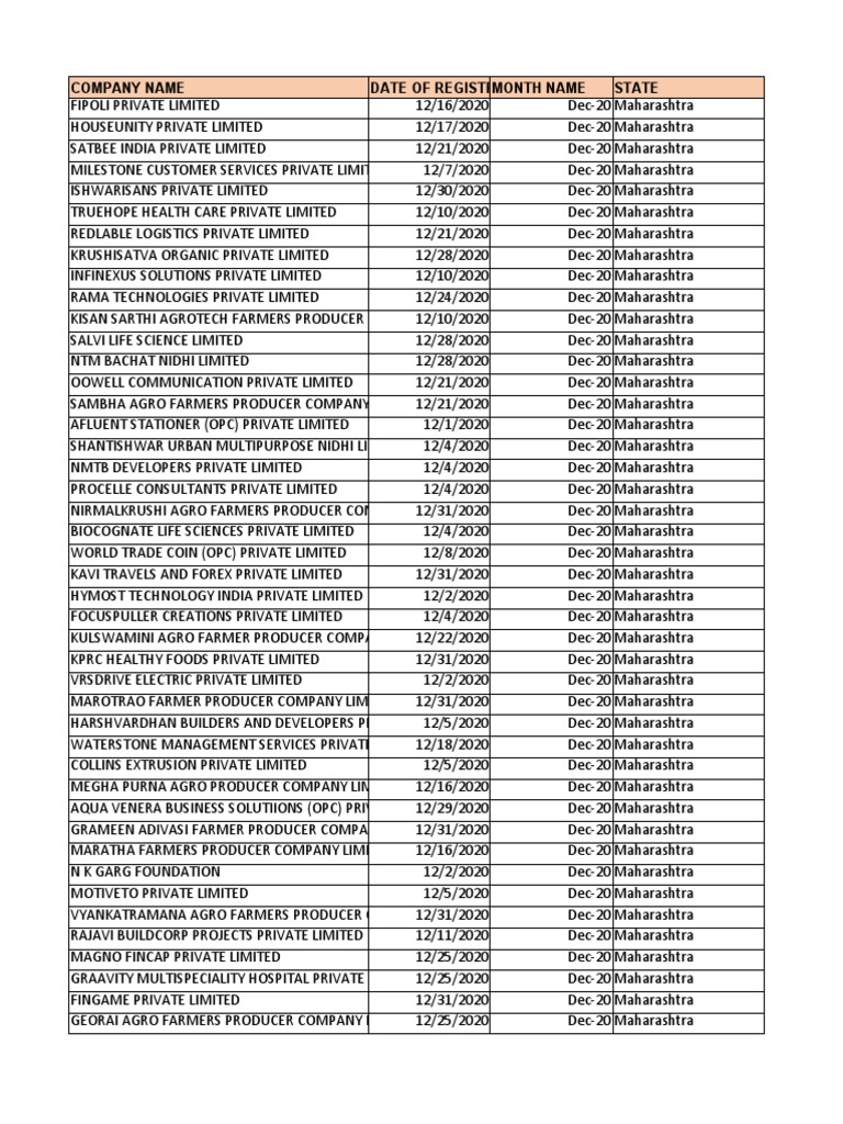 COMPANY NAME DATE OF REGISTRMONTH NAME STATE