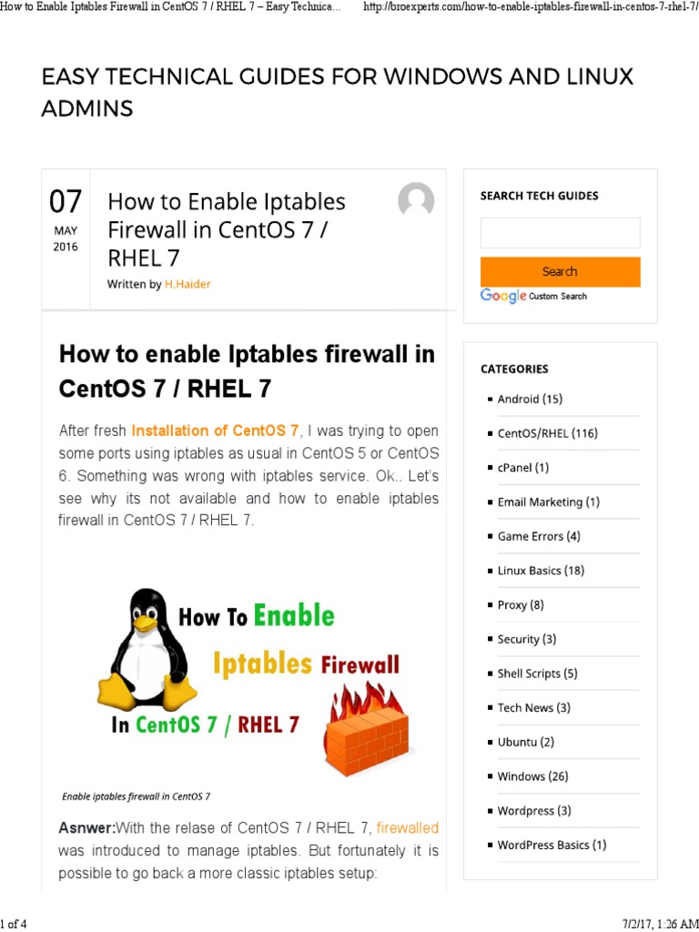 How to Enable Iptables Firewall in CentOS 7 / RHEL 7 – Easy Technica... http://broexperts.