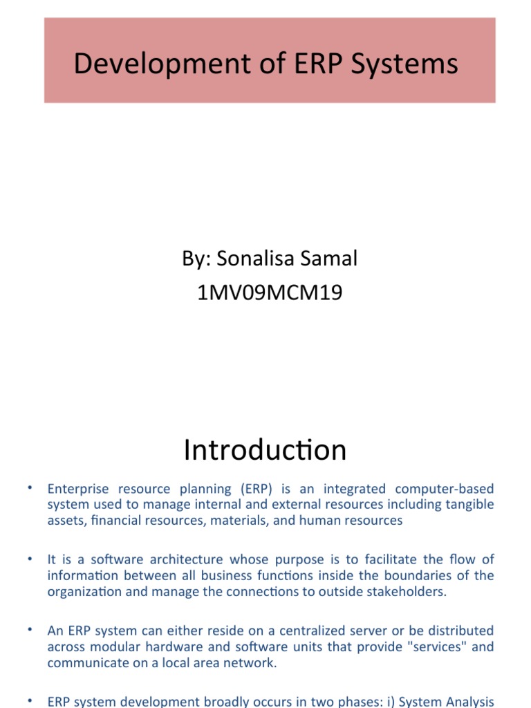 • ERP system development broadly occurs in two phases: i) System Analysis