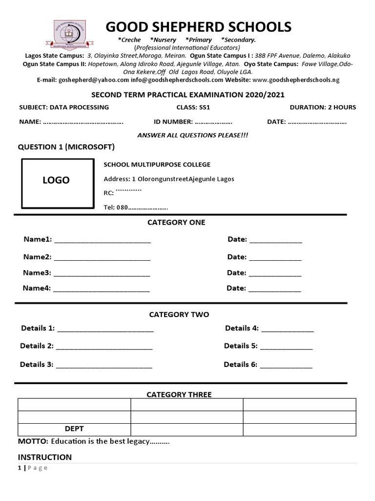 SUBJECT: DATA PROCESSING CLASS: SS1 DURATION: 2 HOURS