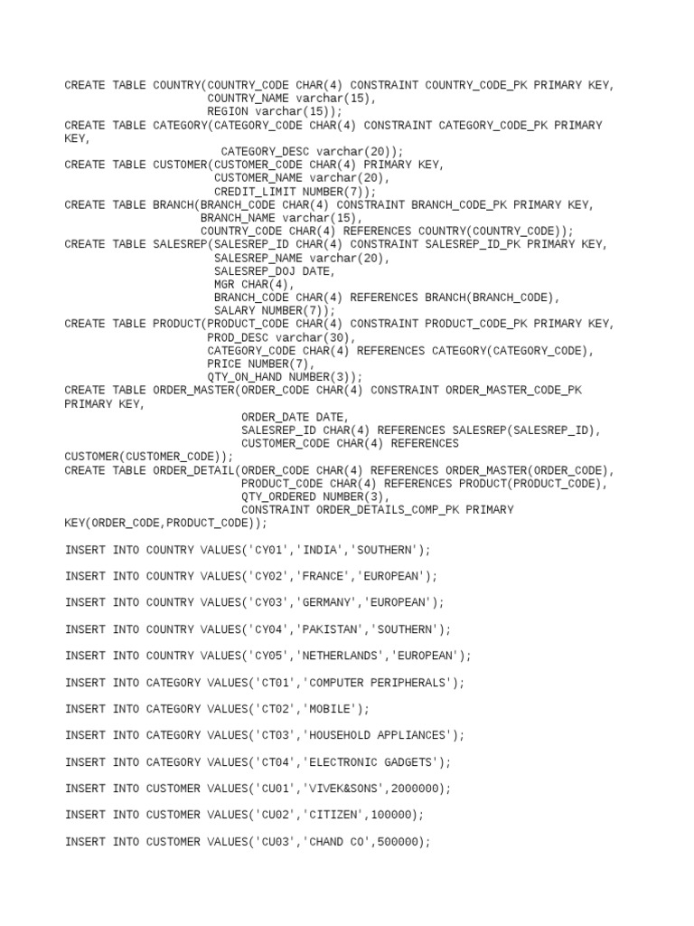 CREATE TABLE COUNTRY(COUNTRY_CODE CHAR(4) CONSTRAINT COUNTRY_CODE_PK PRIMARY KEY,