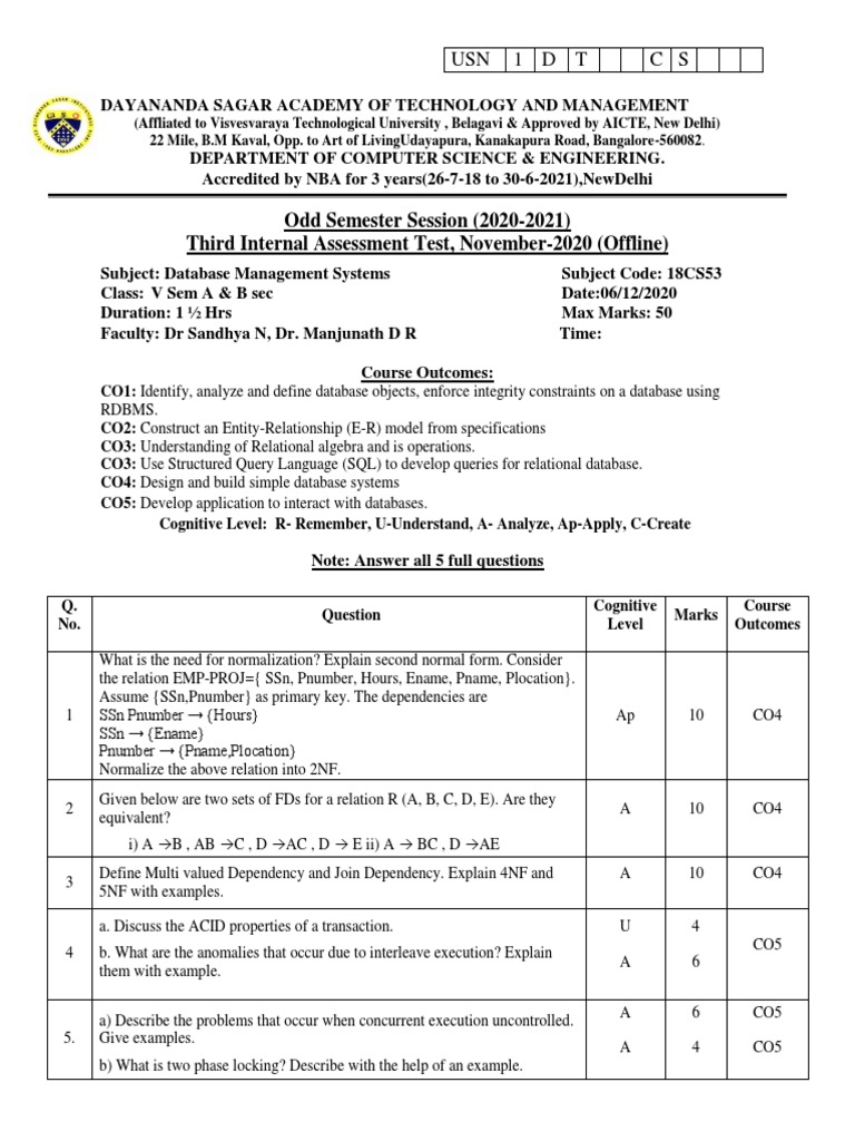 CO1: Identify, analyze and define database objects, enforce integrity constraints on a database using