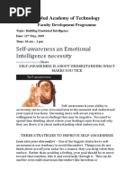 This document provides a reflection tool to help develop self-awareness by identifying an area for improvement, outlining steps to make that change, and setting goals to measure progress. The user fills in the blanks to craft a personal plan for increased self-knowledge and personal development.