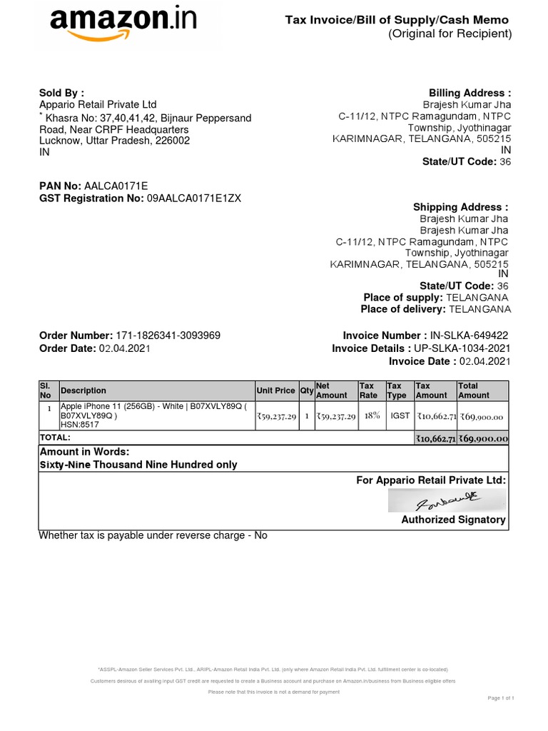 B07XVLY89Q ) ₹59,237.29 1 ₹59,237.29 18% IGST ₹10,662.71 ₹69,900.00