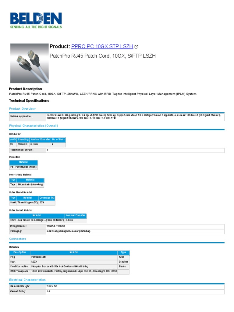 Horizontal and building cabling for Intelligent (RFID based) Patching. Support current and future Category 6a and 6 applications, such as: 10GBase-T (10 Gigabit Ethernet),