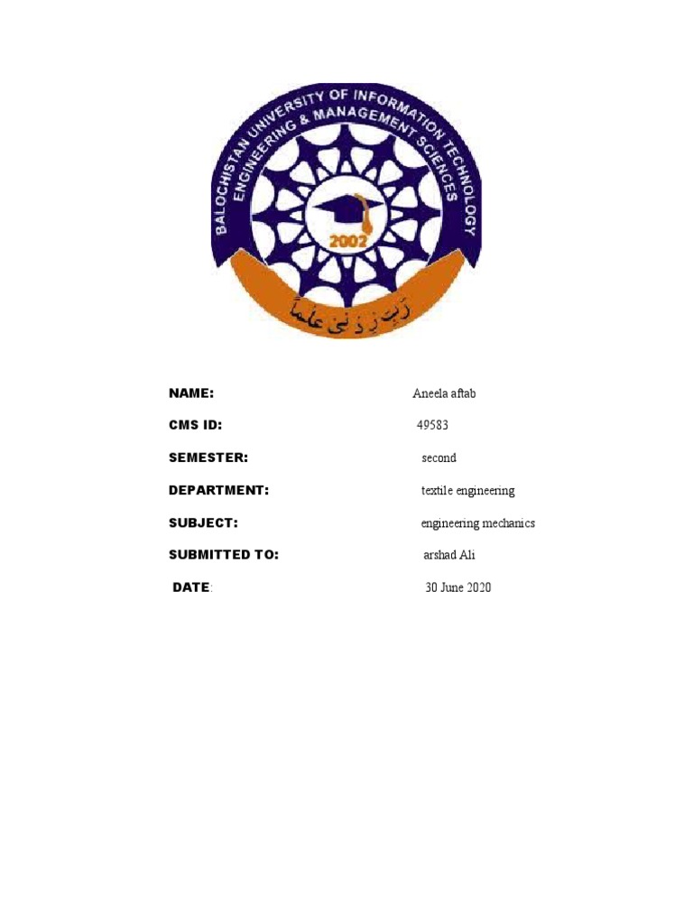 The document provides information about a student named Aneela aftab including her CMS ID, semester, department, subject, instructor submitted to, and date.