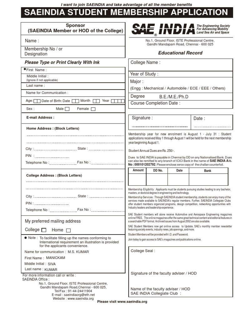 SAEINDIA STUDENT MEMBERSHIP APPLICATION