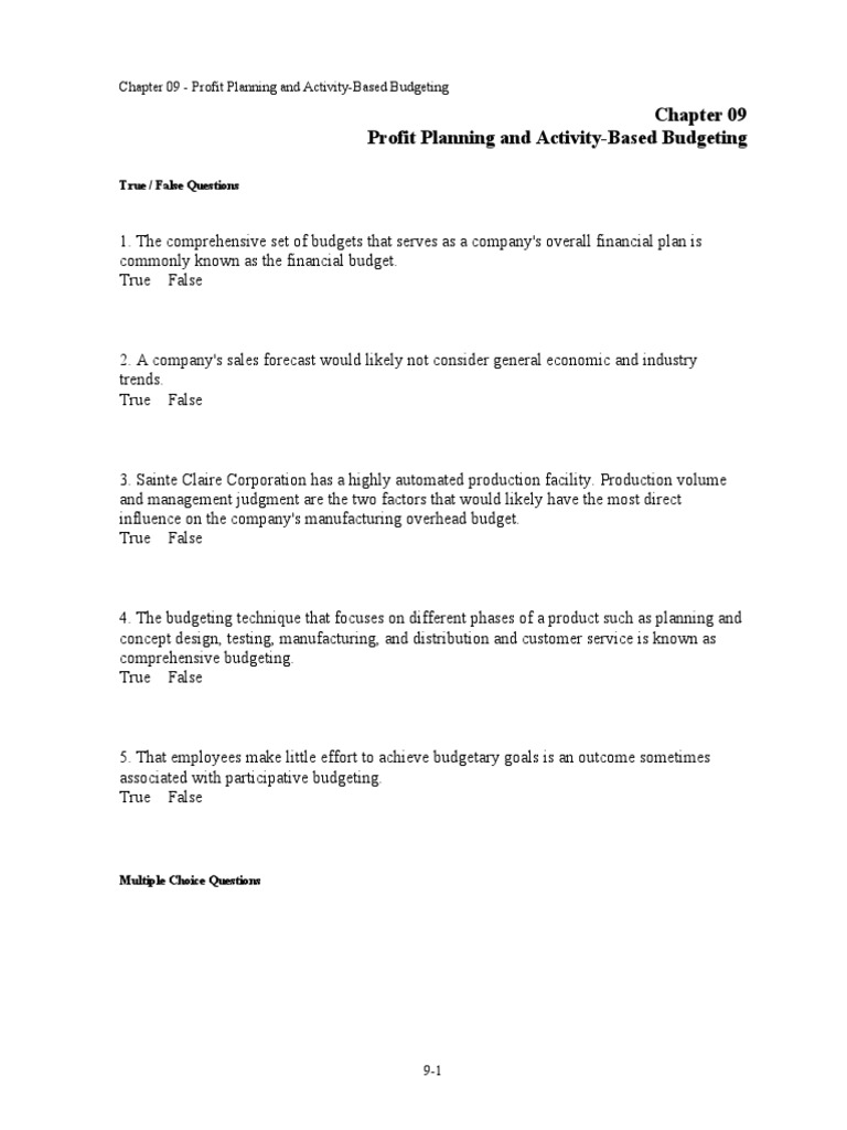 Chapter 09 - Profit Planning and Activity-Based Budgeting