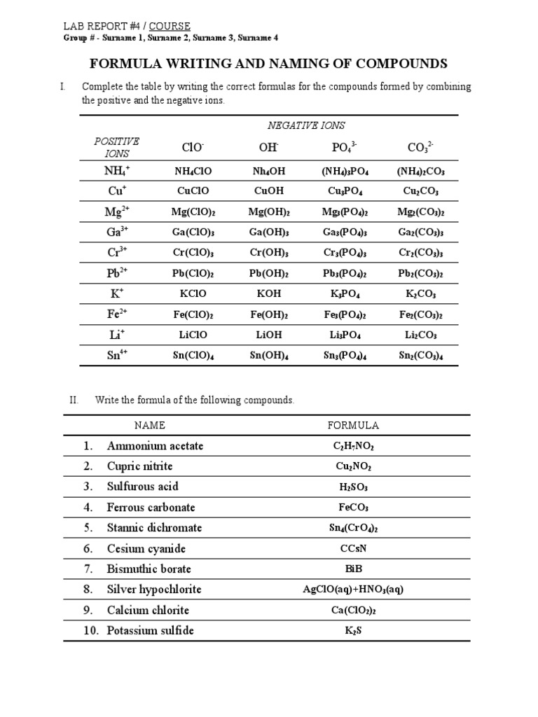 I. Complete the table by writing the correct formulas for the compounds formed by combining