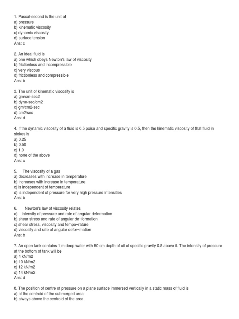 4. If the dynamic viscosity of a fluid is 0.5 poise and specific gravity is 0.5, then the kinematic viscosity of that fluid in
