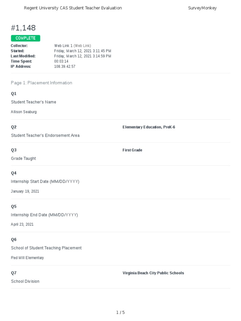 Regent University CAS Student Teacher Evaluation SurveyMonkey