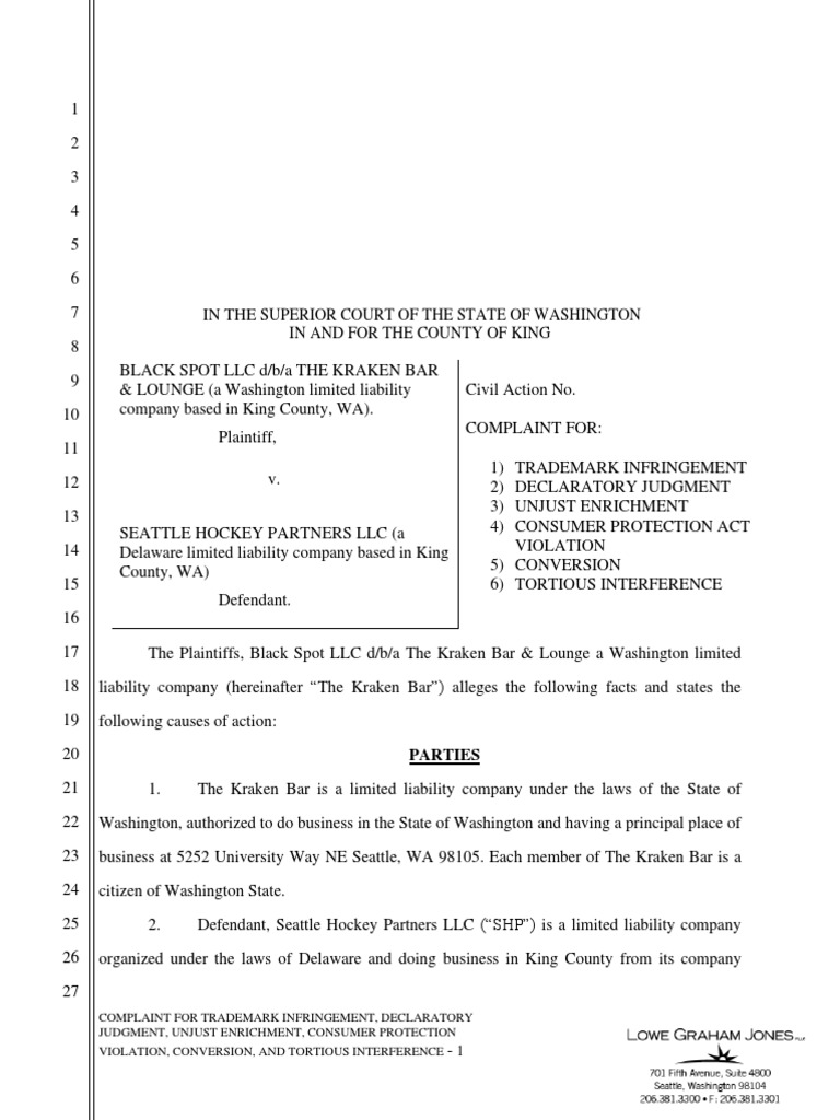 17 The Plaintiffs, Black Spot LLC d/b/a The Kraken Bar & Lounge a Washington limited