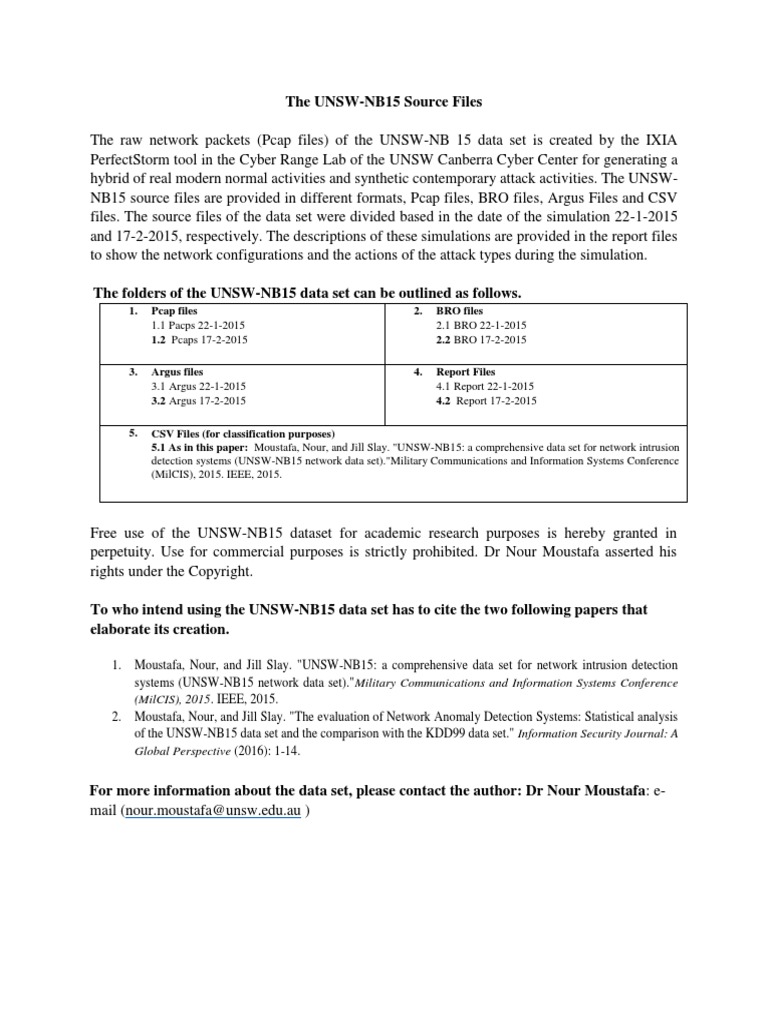 1. Moustafa, Nour, and Jill Slay. "UNSW-NB15: a comprehensive data set for network intrusion detection