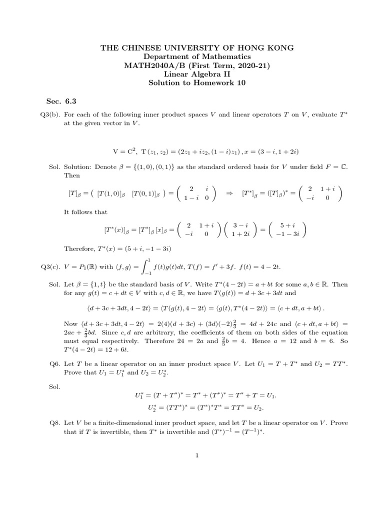 Sol. Let β = {1, t} be the standard basis of V . Write T ∗ (4 − 2t) = a + bt for some a, b ∈ R. Then