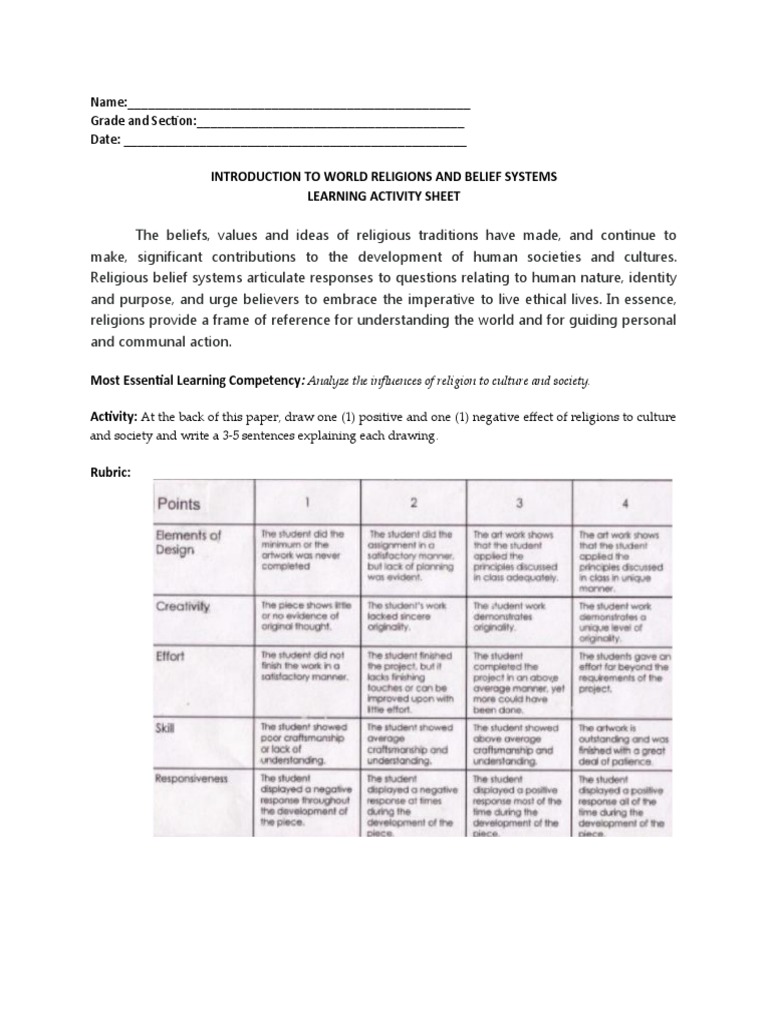 Activity: At the back of this paper, draw one (1) positive and one (1) negative effect of religions to culture