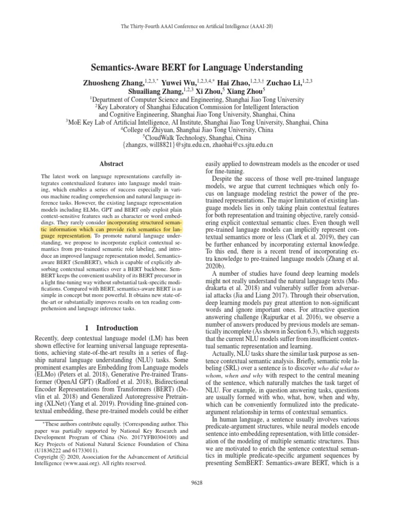 Semantics-Aware BERT For Language Understanding: Zhuosheng Zhang, Yuwei Wu, Hai Zhao, Zuchao Li