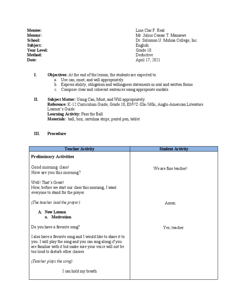 II. Subject Matter: Using Can, Must, and Will appropriately.