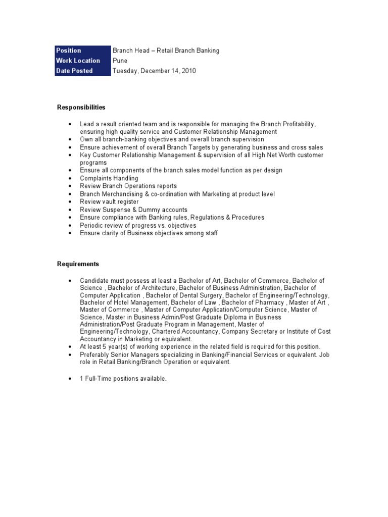 Key Skills: Branch Head – Retail Branch Banking , Branch Profitability, generate business for bank,