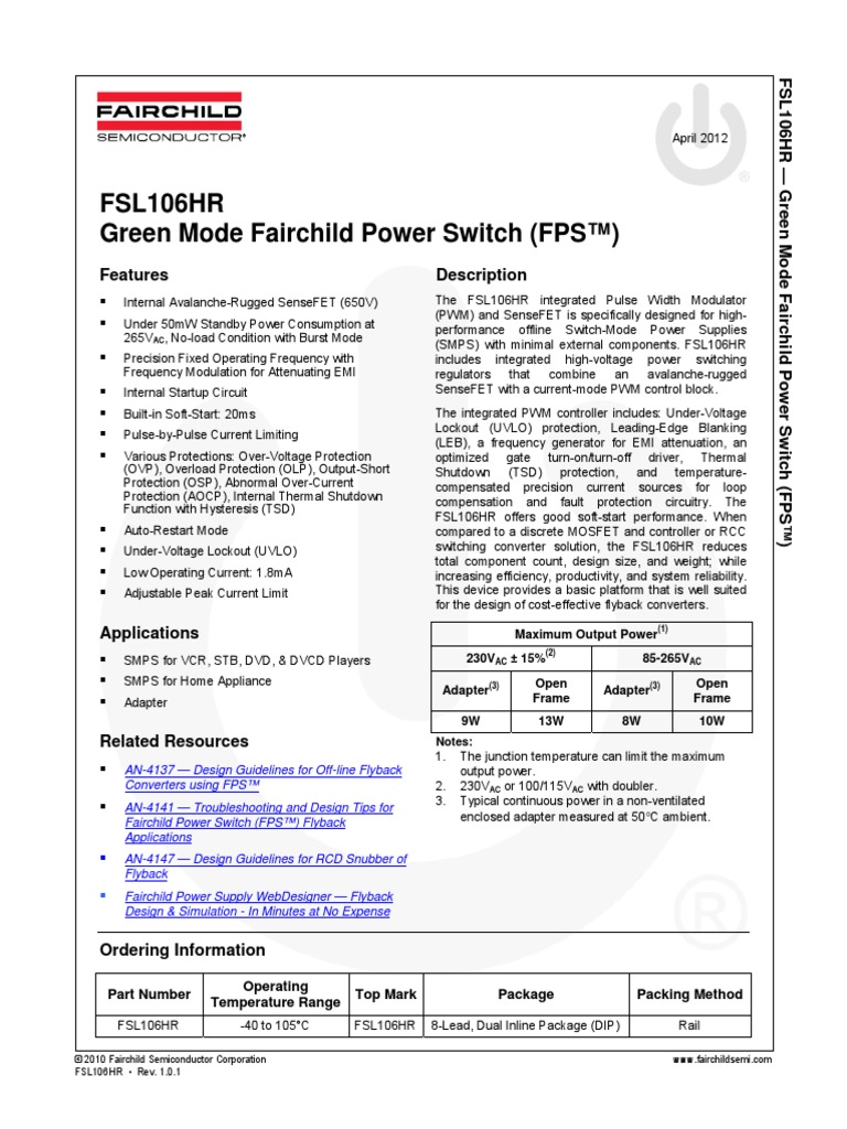 FSL106HR -40 to 105°C FSL106HR 8-Lead, Dual Inline Package (DIP) Rail