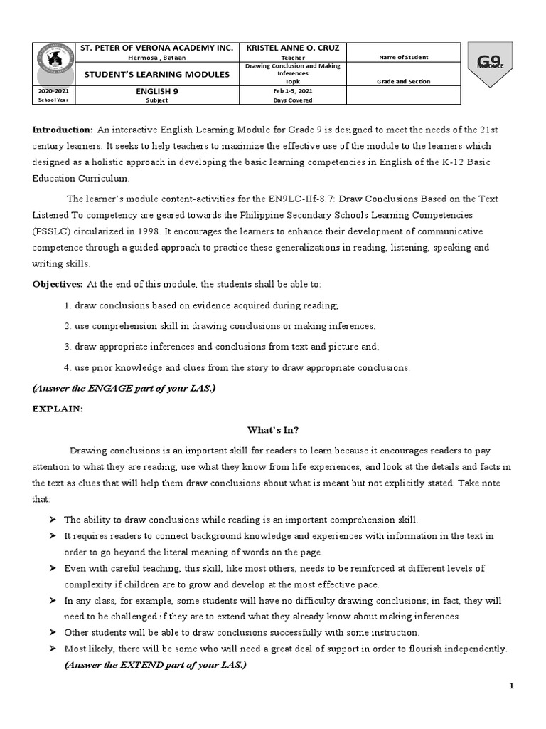 The learner’s module content-activities for the EN9LC-IIf-8.7: Draw Conclusions Based on the Text