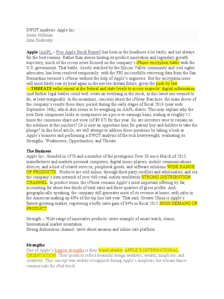 Apple’s business and performing a SWOT analysis of the tech heavyweight, evaluating its