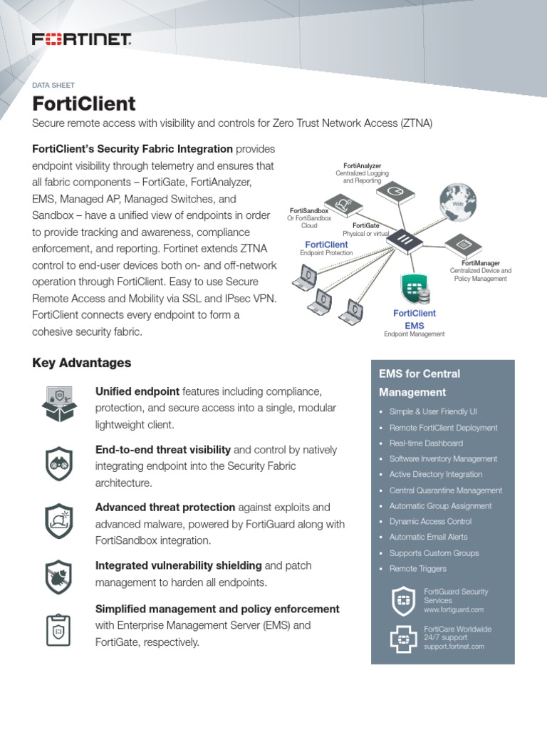 FortiClient integrates the endpoints into Fortiner’s Security Fabric Fortinet extends ZTNA control to end-user devices both on- and