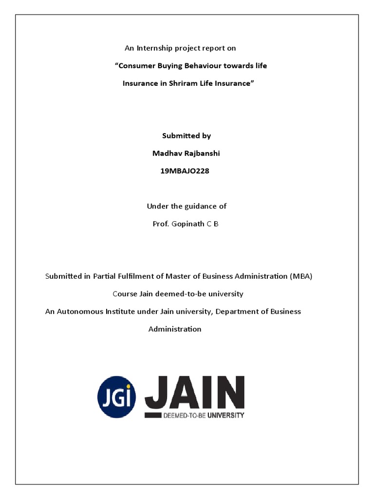 Insurance in Shriram Life Insurance’, is prepared by him under the guidance of