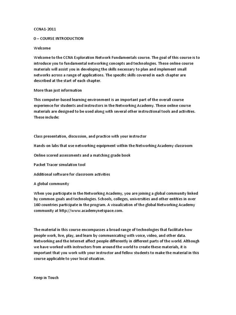 Welcome to the CCNA Exploration Network Fundamentals course. The goal of this course is to