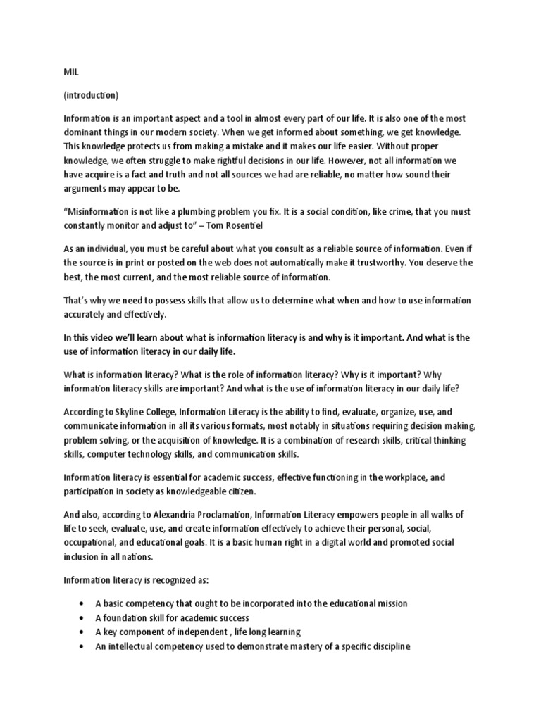 What is information literacy? What is the role of information literacy? Why is it important? Why