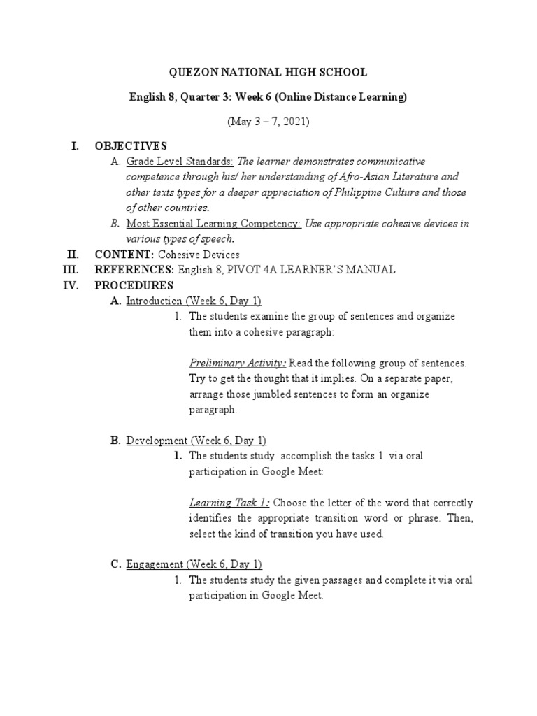 English 8, Quarter 3: Week 6 (Online Distance Learning)