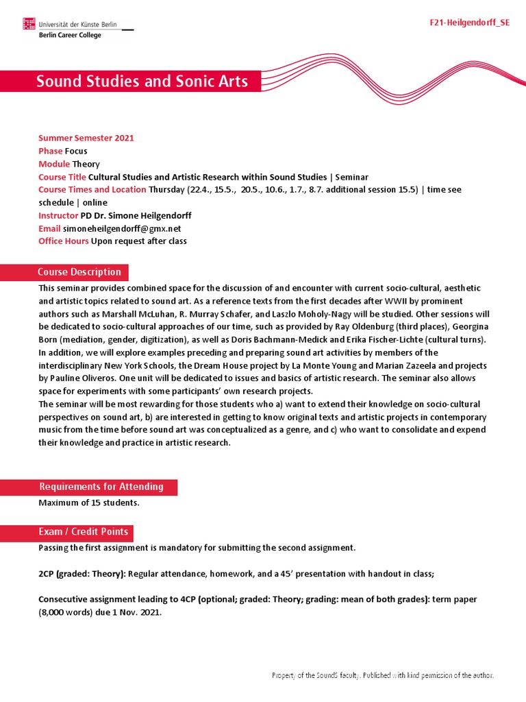 Course Title Cultural Studies and Artistic Research within Sound Studies | Seminar