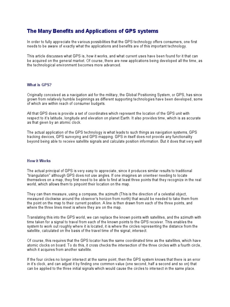 This article discusses what GPS is, how it works, and what current uses have been found for it that can